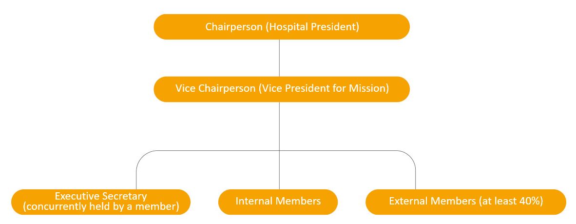 The hospital's highest governing body is the Board of Directors of Fu Jen Catholic University, which oversees FJUH through the Hospital Management Committee. The governance and management teams collaborate to plan organizational structures, command systems, and establish internal supervision and governance mechanisms.