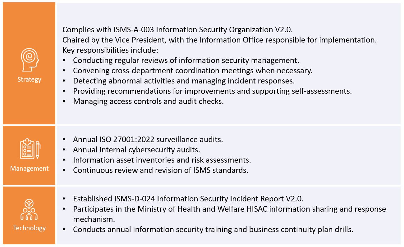 Risk management is a key mechanism for FJUH's sustainable operations and patient safety. The hospital emphasizes systematic identification and control of both internal and external risks. Regular assessments and contingency planning are conducted to identify and mitigate risk factors that may impact operations, medical quality, information security, regulatory compliance, and public health incidents, thereby mitigating potential short- and long-term impacts.