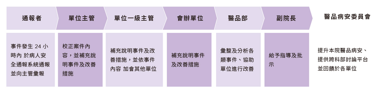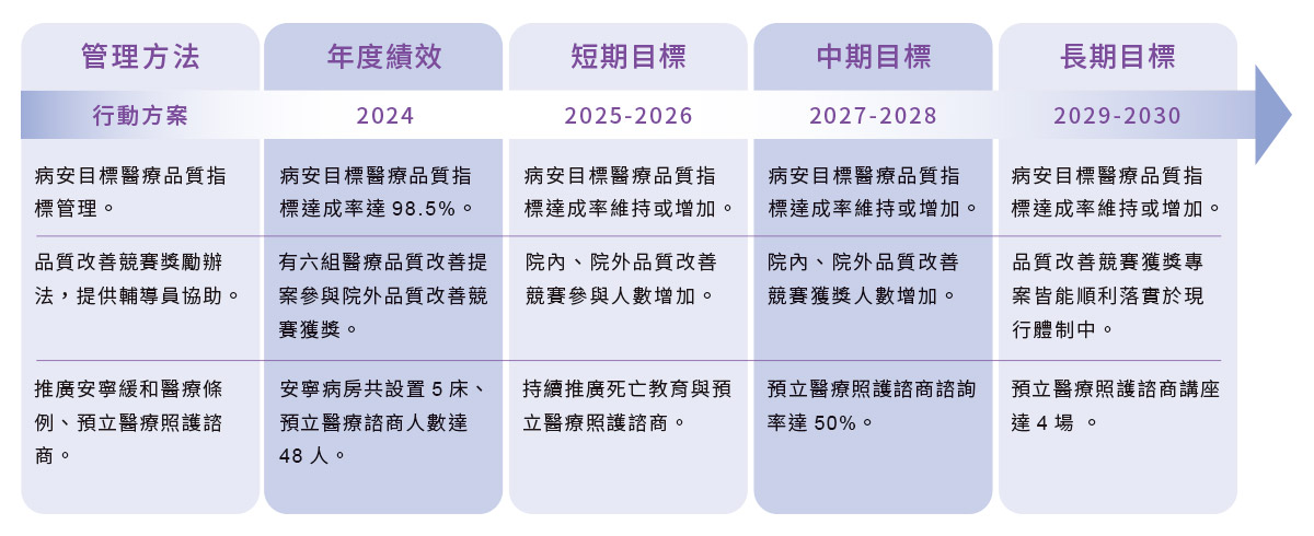 本院定期依據衛生福利部發布之病人安全工作目標,研擬年度病人安全執行計畫。計畫內容涵蓋促進醫療人員間團隊合作及有效溝通、營造病人安全文化、落實病人安全事件管理、提升手術安全、預防病人跌倒、提升用藥安全、落實感染管制、提升管路安全、鼓勵病人及家屬參與病人安全工作及維護孕產兒安全等重點面向。經內部審議程序審查通過後,提報委員會核定,隨即由相關部門分工執行,確保病人安全策略具體落實並持續優化。