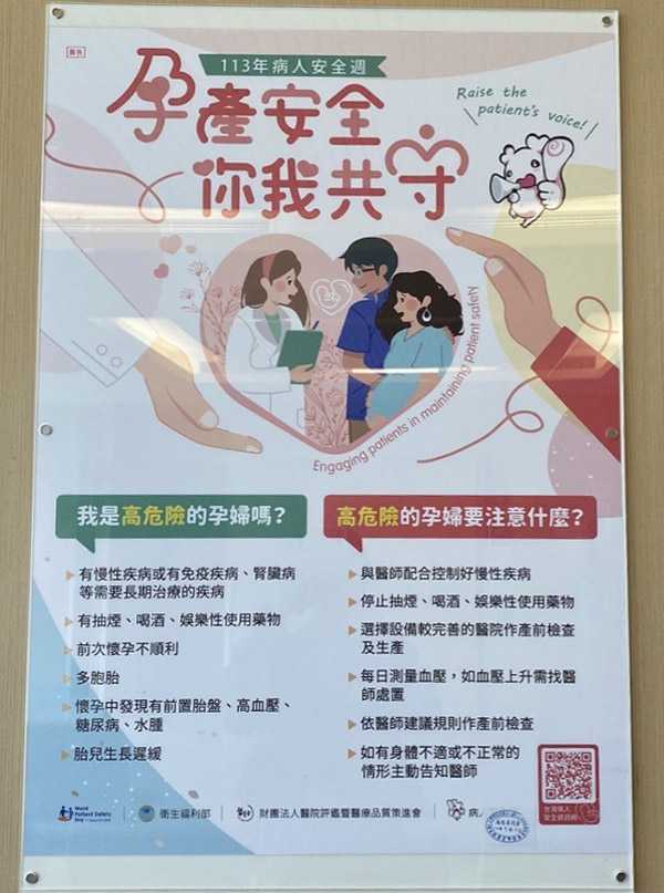 每年9-10月間,輔大醫院皆會進行病人安全週的活動,創意利用醫策會提供之電子素材,進行對院內、院外的病人安全活動宣傳。2024年之病人安全宣傳主題為「孕產安全·你我共守」、「安全診斷·健康把關」。本院在活動中,向醫院病人、家屬、社區居民宣導高危險孕婦應注意事項,並配合社區醫療活動,於2024年10月1日走入社區進行相關宣導活動,鼓勵所有民眾,若遇到就醫、病人安全相關的疑問,皆應與醫院連繫,建立良好醫病關係,守護病人安全。
