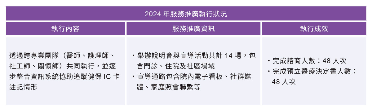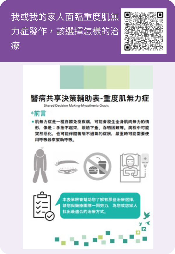 SDM)理念,強化醫病間的溝通與互信關係。醫病共享決策強調醫療人員與病人雙方共同參與治療選擇的過程,醫師提供具實證基礎之醫療資訊,病人則表達個人偏好與價值觀,藉由雙向溝通,共同達成最符合病人需求與意願的治療決策。本院同時導入決策輔助工具(Patient