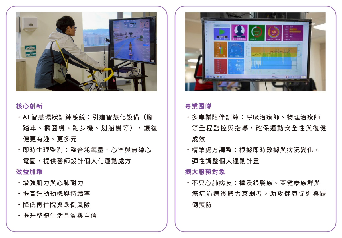 智慧運動訓練系統,結合即時心電圖與個人化運動處方,打造安全、有趣且精準的心肺復健新模式。多專業團隊陪伴,協助病友強化心肺功能與體能,讓康復路上不孤單,更有效。