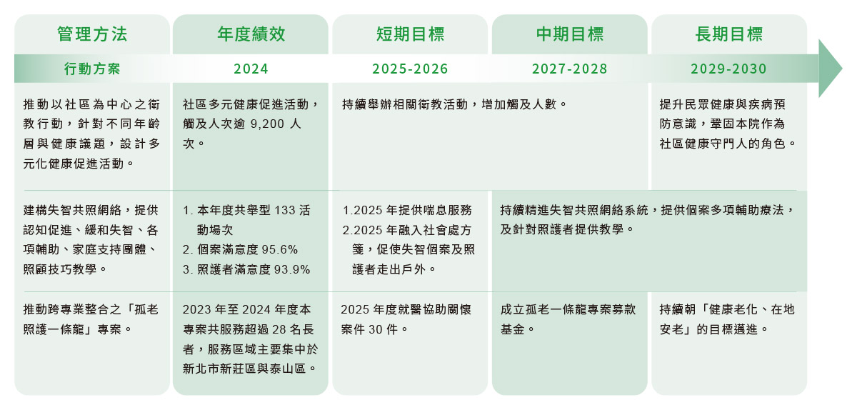 本院積極串聯照服務在地資源,與110家長照機構合作,強化社區醫療服務之效能,社醫部於2024年榮獲第一屆新北市長照卓越獎,為新北市區域級醫院中首度獲此殊榮之機構,顯示本院在高齡及社區醫療關懷政策落實與永續照護倡議中之領導角色。