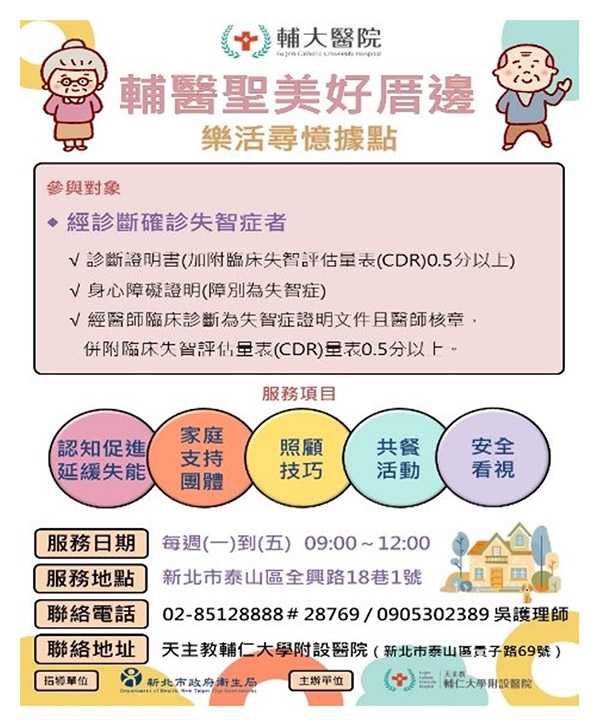 為推廣「失智症早期診斷、早期治療」理念,並強化社區照護資源,本院致力於建立標準化的失智症照護流程,實現在地化與永續經營之目標。本院積極建構失智共照網絡,提供延緩失智、認知促進、家庭支持團體、照顧技巧、供餐活動等服務,減緩失智者功能退化,並教導照顧者照護技巧等。2024年共照顧20個失智家庭,並辦理照顧者支持團體等課程,共服務逾1,000人次,協助家庭強化照顧知識與溝通能力,有效延緩長者退化進程,實踐以家庭為主要項目之整合照護模式。